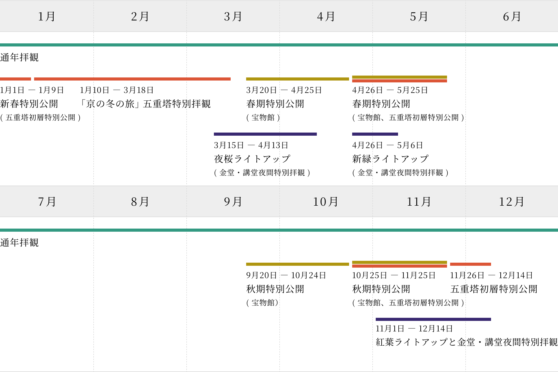 ※「京都修学旅行パスポート」を利用すると、金堂・講堂または五重塔初層内部、金堂・講堂の拝観料が割引になります。